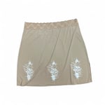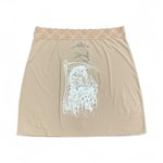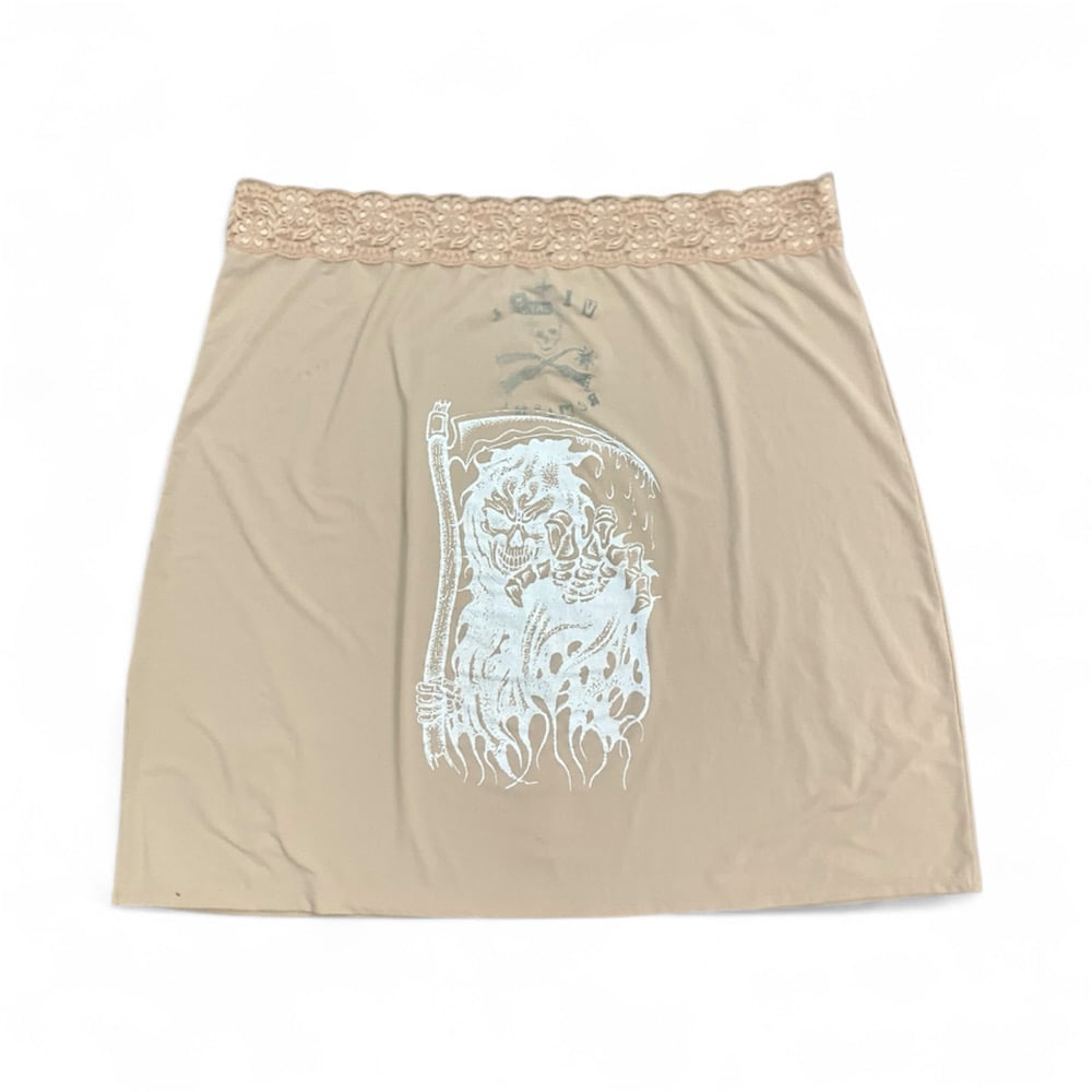 One-of-one Tan Slip Skirt — Hand printed at Vital Remains in LA. Soft tan slip skirt featuring the Tearin’ Through Em’ Skull print on the front and the Reaper print on the rear.