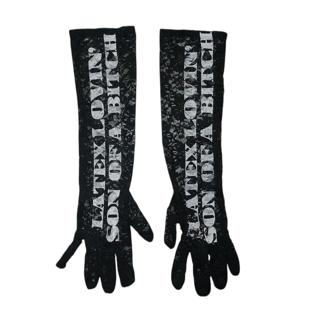 Latex Lovin Son Of A Bitch Black Lace Gloves — Hand printed at Vital Remains in LA. Revival capsule release marking four years of the original Latex Lovin Son Of A Bitch print on black lace gloves.