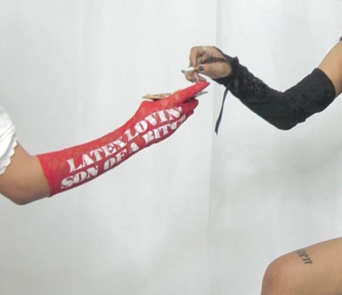 Latex Lovin Son Of A Bitch Red Lace Gloves — Hand printed at Vital Remains in LA. Revival capsule release marking four years of the original Latex Lovin Son Of A Bitch print on red lace gloves.