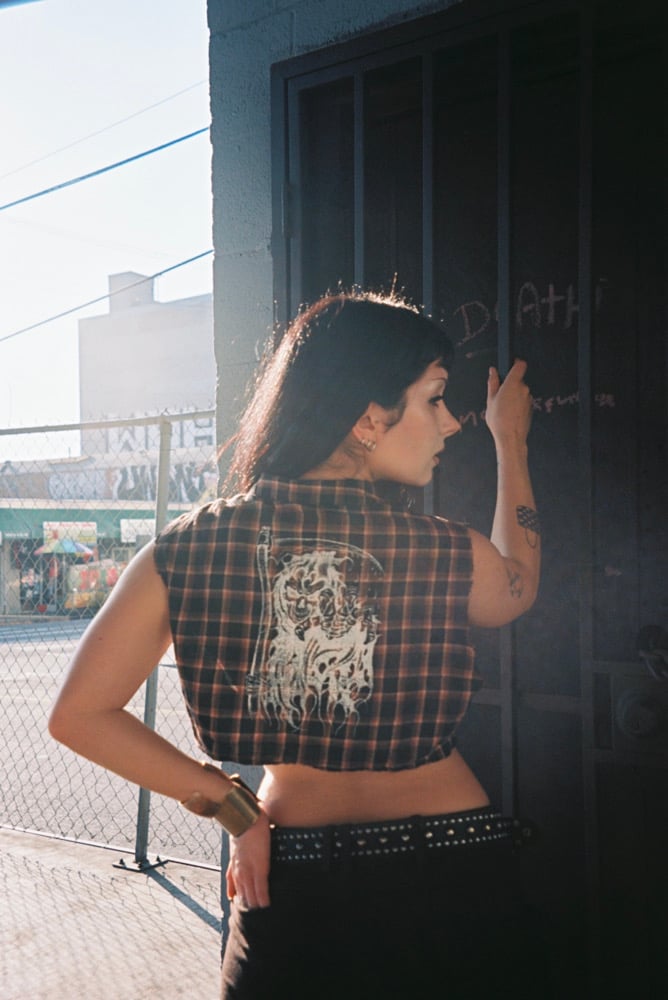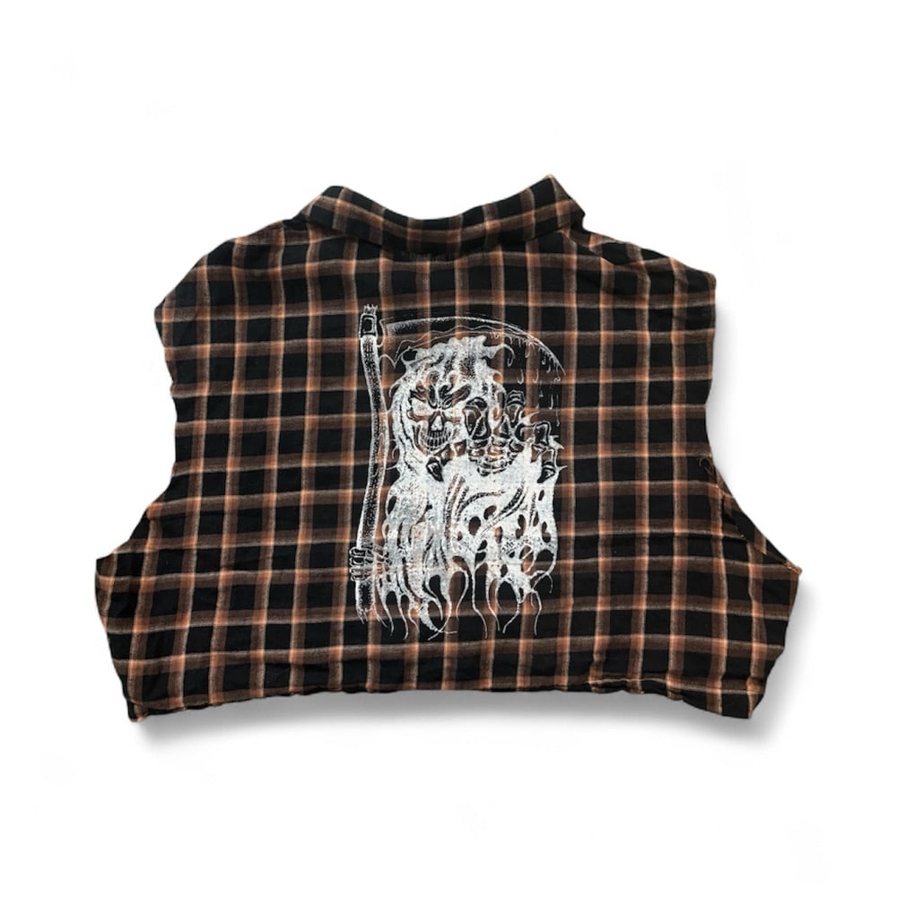 Pulled by hand at Vital Remains in LA — One-of-one cropped and sleeveless flannel featuring the Reaper print on the back and ‘93 Tribal Skull detailing along the collar. Distressed finish throughout.